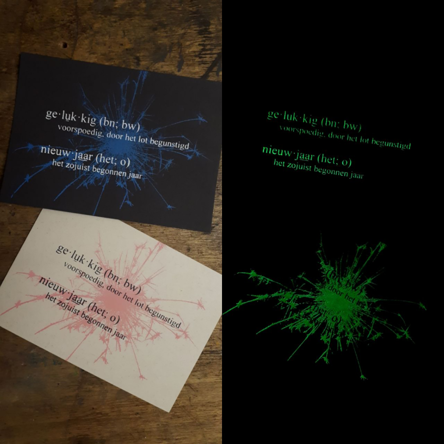 Deze wenskaart is handmatig gedrukt door middel van zeefdruk op 300 grams kringlooppapier. De witte tekst is voorzien van een ‘glow in the dark’-laagje waardoor het oplicht in het donker!